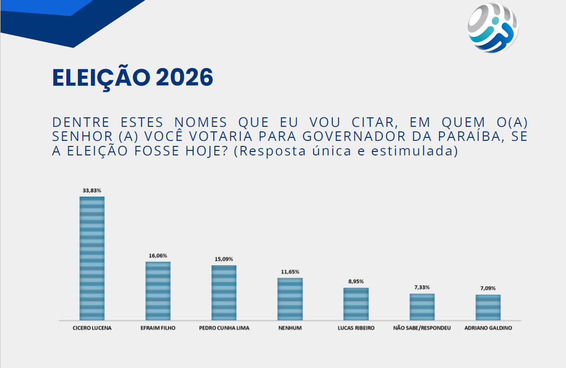 A pesquisa realizada pelo Instituto DataRanking, em parceria com o Portal Fonte83 e divulgada nesta terça-feira (12), aponta o prefeito de João Pessoa, Cícero Lucena (PP), como líder na disputa pelo Governo da Paraíba em 2026, com 33,83% das intenções de voto no cenário estimulado. O senador Efraim Filho (União Brasil) aparece em segundo lugar com 16,06%, seguido pelo ex-deputado Pedro Cunha Lima (PSD) com 15,09%.