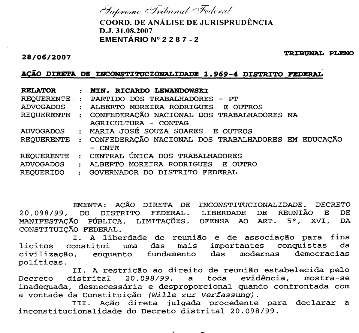 O Supremo Tribunal Federal (STF), ao julgar a ADI em 2002, declarou o decreto inconstitucional por violar o direito fundamental à liberdade de reunião, garantido pelo artigo 5º, inciso XVI, da Constituição Federal. O julgamento, relatado pelo ministro Mauricio Corrêa, teve decisão unânime e reforçou que restrições a manifestações públicas devem respeitar os princípios da proporcionalidade e razoabilidade, além de exigir regulamentação específica que não suprima o exercício do direito.